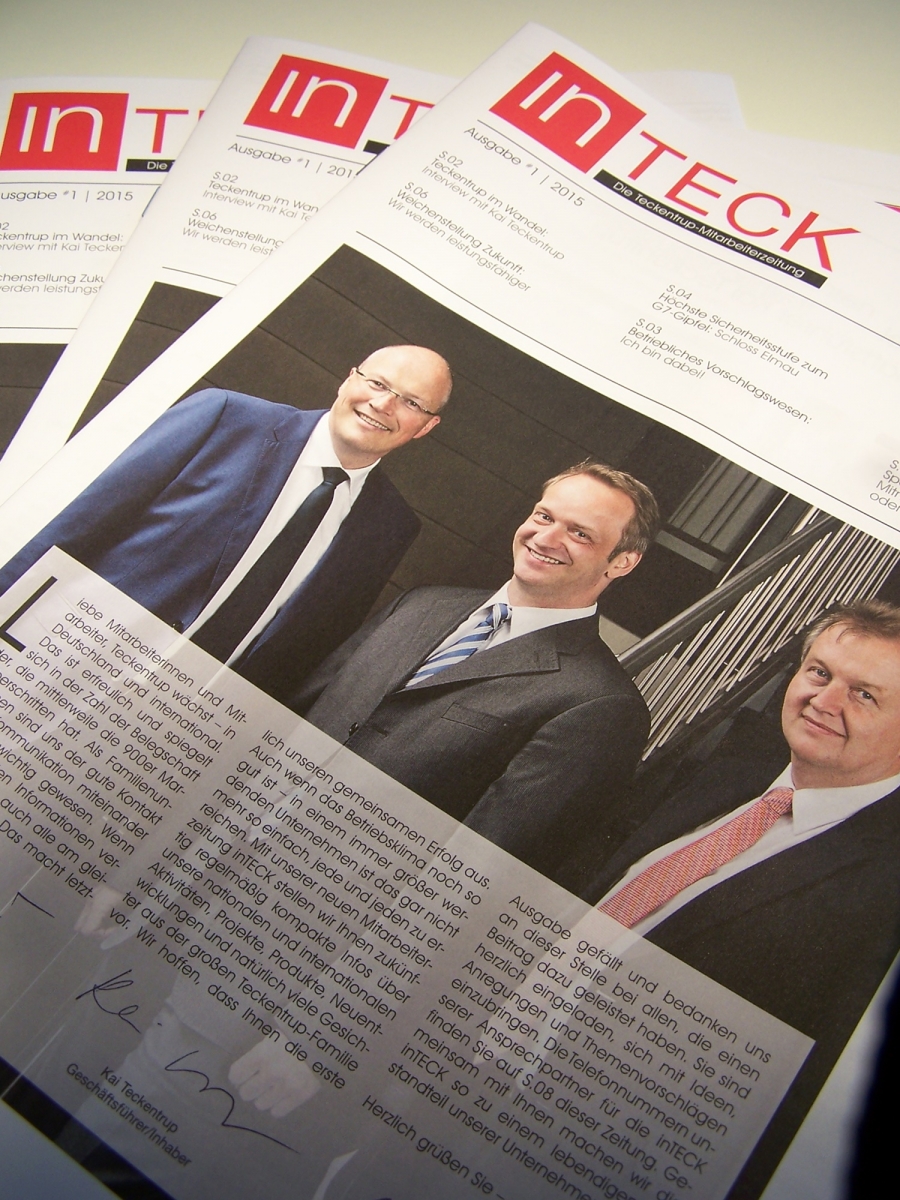 Für die Personalabteilung von Teckentrup ist die Mitarbeiterzeitung ein wichtiges Sprachrohr. Die 8-seitige Zeitung im A4-Format informiert und klärt auf: über Visionen und Ziele des Unternehmens, über nationale und internationale Aktivitäten, Produkte, Neuentwicklungen sowie Fertigungsprozesse. Außerdem sollen Zugehörigkeitsgefühl und Betriebsklima gestärkt werden. Viel Personality prägt daher die inTECK. Mitarbeiterinnen und Mitarbeiter zeigen Gesicht, O-Töne vermitteln Authentizität und kompakte Texte übernehmen den Wissenstransfer. Und jeder darf sich dazu aufgerufen fühlen, eigene Ideen, Anregungen und Themenvorschläge an das Redaktionsteam zu richten. So wächst das Medium gemeinschaftlich und wird zum lebendigen Bestandteil der Unternehmenskultur.