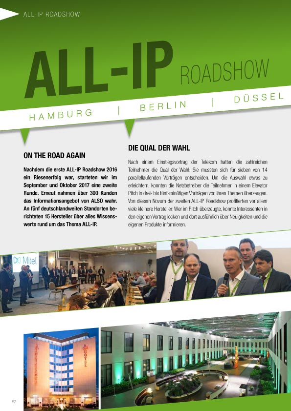Nachdem die erste ALL-IP Roadshow 2016 ein Riesenerfolg war, starteten wir im September und Oktober 2017 eine zweite Runde. Erneut nahmen über 300 Kunden das Informationsangebot der ALSO wahr. An fünf deutschlandweiten Standorten berichteten 15 Hersteller über alles Wissenswerte rund um das Thema ALL-IP.