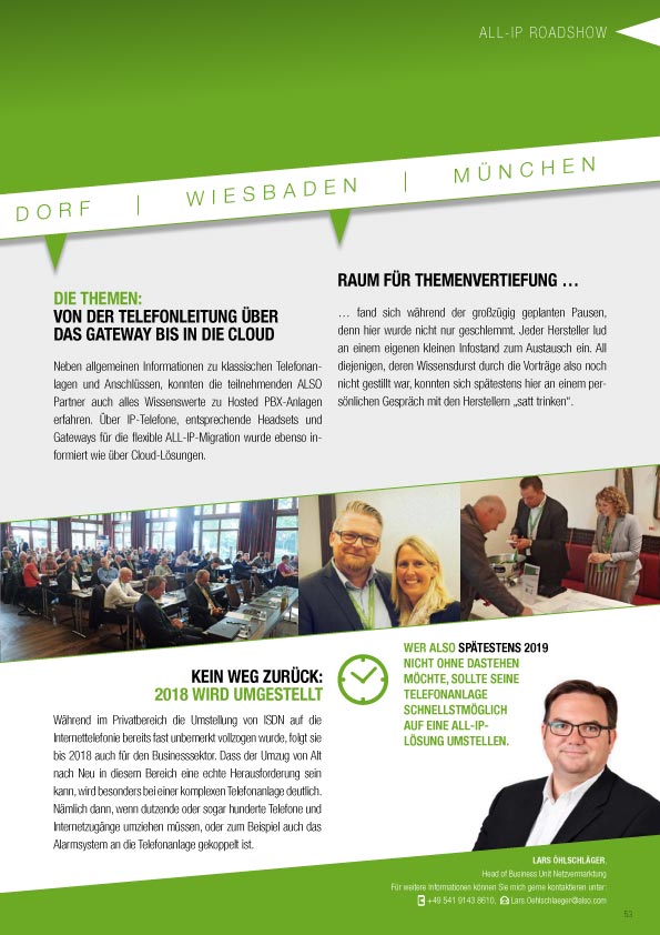 chlüssen, konnten die teilnehmenden ALSO Partner auch alles Wissenswerte zu Hosted PBX-Anlagen erfahren. Über IP-Telefone, entsprechende Headsets und Gateways für die flexible ALL-IP-Migration wurde ebenso informiert wie über Cloud-Lösungen.