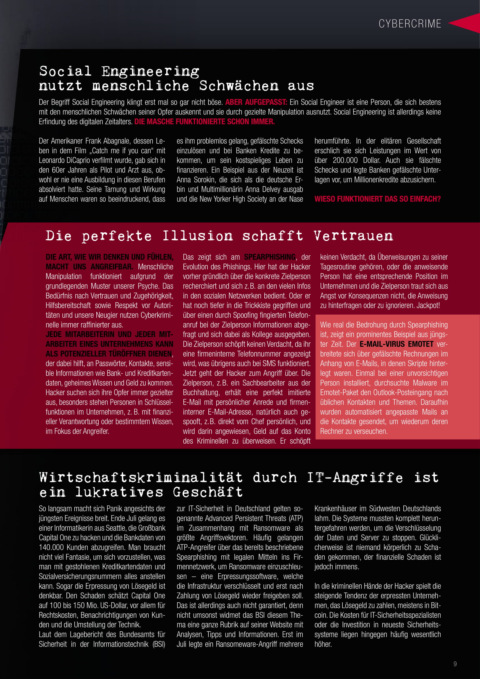 Die Art wie wir denken und fühlen macht uns angreifbar. Menschliche Manipulation funktioniert aufgrund der grundlegenden Muster unserer Psyche. Das Bedürfnis nach Vertrauen und Zugehörigkeit, Hilfsbereitschaft sowie Respekt vor Autoritäten und unsere Neugier nutzen Cyberkriminelle immer raffinierter aus. Jede Mitarbeiterin und jeder Mitarbeiter eines Unternehmens kann als potenzieller Türöffner dienen, um an Passwörter, Kontakte, sensible Informationen wie Bank- und Kreditkartendaten, geheimes Wissen und Geld zu kommen. Hacker suchen sich ihre Opfer immer gezielter aus, besonders stehen Personen in Schlüsselfunktionen im Unternehmen, z. B. mit finanzieller Verantwortung oder bestimmtem Wissen, im Fokus der Angreifer.