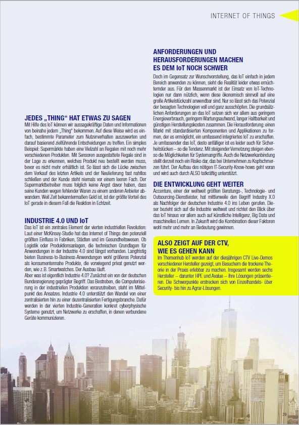 Im Themenhub IoT werden auf der diesjährigen CTV Live-Demos verschiedener Hersteller gezeigt, um Besuchern die trockene Theorie in der Praxis erlebbar zu machen. Insgesamt werden sechs Hersteller – darunter HPE und Avalue – ihre Lösungen präsentieren. Die Schwerpunkte erstrecken sich von Einzelhandels- über Security- bis hin zu Agrar-Lösungen. Seien Sie gespannt! Vielleicht erkennen Sie auf unserer Hausmesse die Potenziale für Ihr Geschäft.
