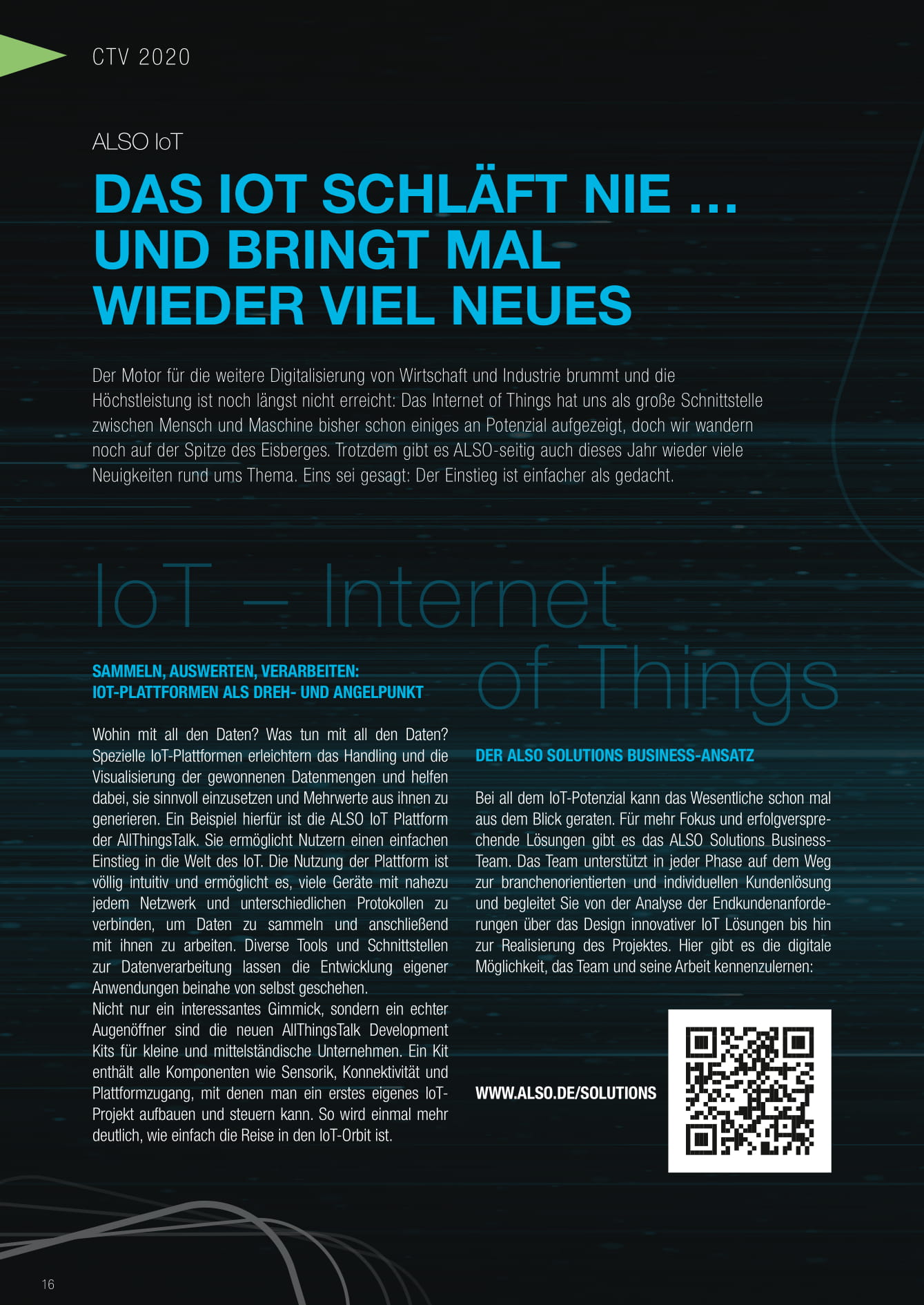 Bei all dem IoT-Potenzial kann das Wesentliche schon mal aus dem Blick geraten. Für mehr Fokus und erfolgsversprechende Lösungen gibt es das ALSO Solutions Business Team. Das Team unterstützt in jeder Phase auf dem Weg zur branchenorientierten und individuellen Kundenlösung und begleitet von der Analyse der Endkundenanforderungen über das Design innovativer IoT Lösungen bis hin zur Realisierung des Projektes. Auf der CTV gibt es die Möglichkeit das Team kennenzulernen. Vorabinformationen gibt es unter www.also.de/solutions.
