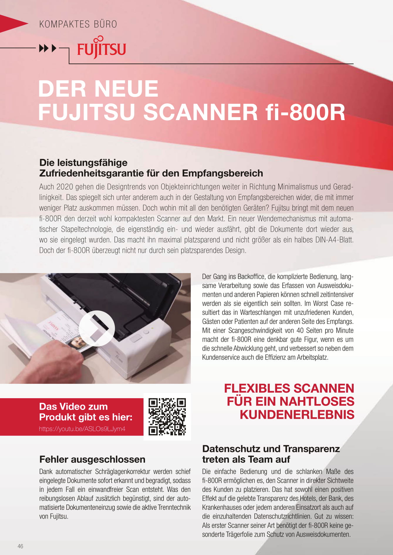 Auch 2020 gehen die Designtrends von Objekteinrichtungen weiter in Richtung Minimalismus und Geradlinigkeit. Das spiegelt sich unter anderem auch in der Gestaltung von Empfangsbereichen wider, die mit immer weniger Platz auskommen müssen. Doch wohin mit all den benötigten Geräten? Fujitsu bringt mit dem neuen fi-800R den derzeit wohl kompaktesten Scanner auf den Markt. Ein neuer Wendemechanismus mit automatischer Stapeltechnologie, die automatisch ein- und wieder ausfährt, gibt die Dokumente dort wieder aus, wo sie eingelegt wurden. Das macht ihn maximal platzsparend und nicht größer als ein halbes DIN-A4-Blatt. Doch der fi-800R überzeugt nicht nur durch sein platzsparendes Design.