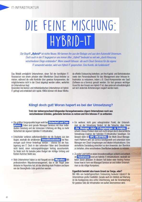 - Zu guter Letzt fehlt es vielen Innovationswilligen schlicht und einfach an Fachwissen rund um hybride IT-Infrastrukturen, weshalb sie lieber davon ablassen. In diesem Fall bieten viele Hosting Partner Know-how in Form von Managed Services an und stellen Unternehmen so die nötige Kompetenz.