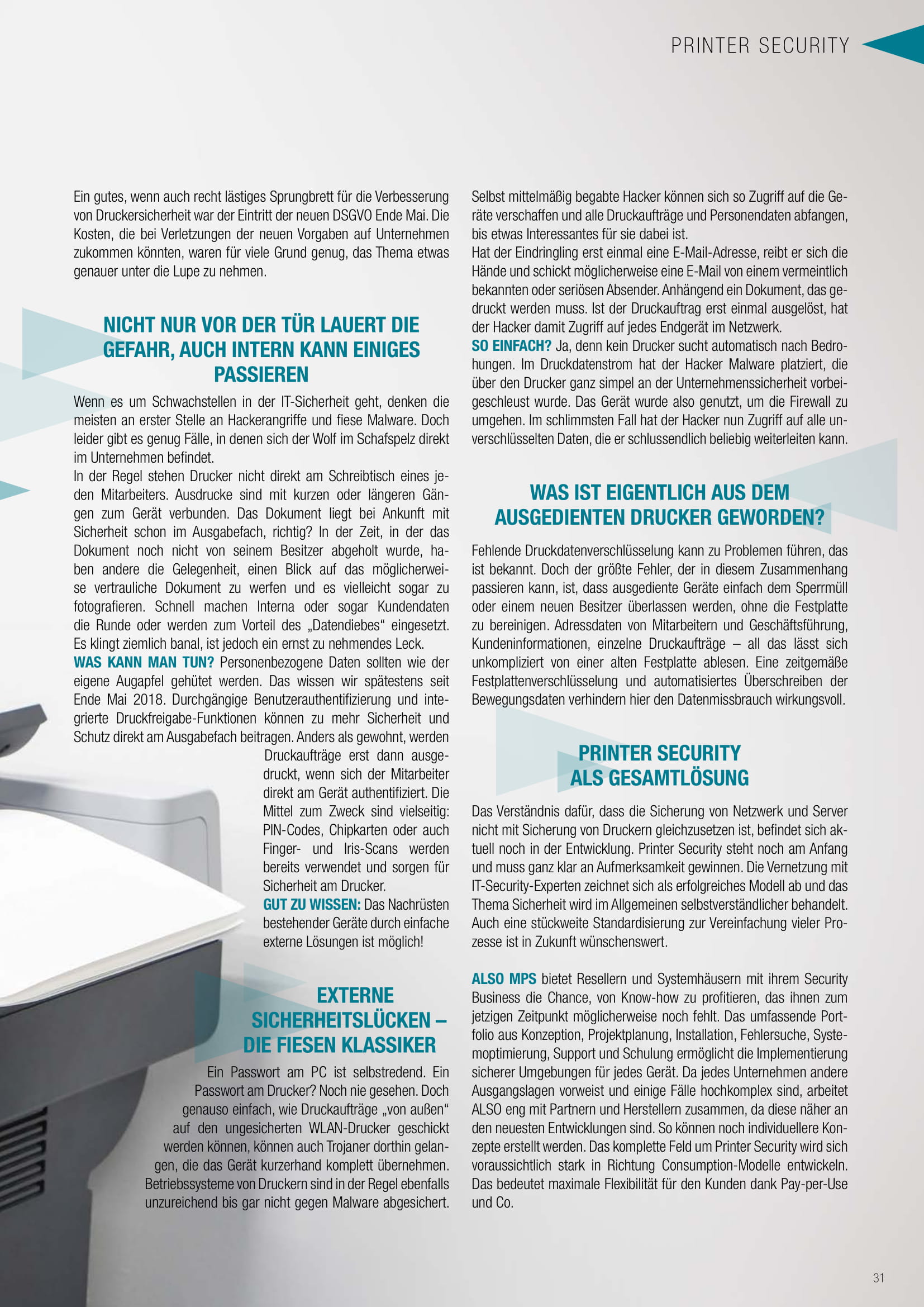 Die ALSO MPS bietet Resellern und Systemhäusern mit ihrem Security Business die Chance, von Know-how zu profitieren, welches ihnen zum jetzigen Zeitpunkt möglicherweise noch fehlt. Das umfassende Portfolio aus Konzeption, Projektplanung, Installation, Fehlersuche, Systemoptimierung, Support und Schulung ermöglicht die Implementierung sicherer Umgebungen für jedes Gerät. Da jedes Unternehmen andere Ausgangslagen vorweist und einige Fälle hoch komplex sind, arbeitet die ALSO eng mit Partnern und Herstellern zusammen, da diese näher an den neuesten Entwicklungen sind. So können noch individuellere Konzepte erstellt werden. Das komplette Feld um Printer Security wird sich voraussichtlich stark in Richtung Consumption Modelle entwickeln. Das bedeutet maximale Flexibilität für den Kunden dank Pay-per-Use und Co.