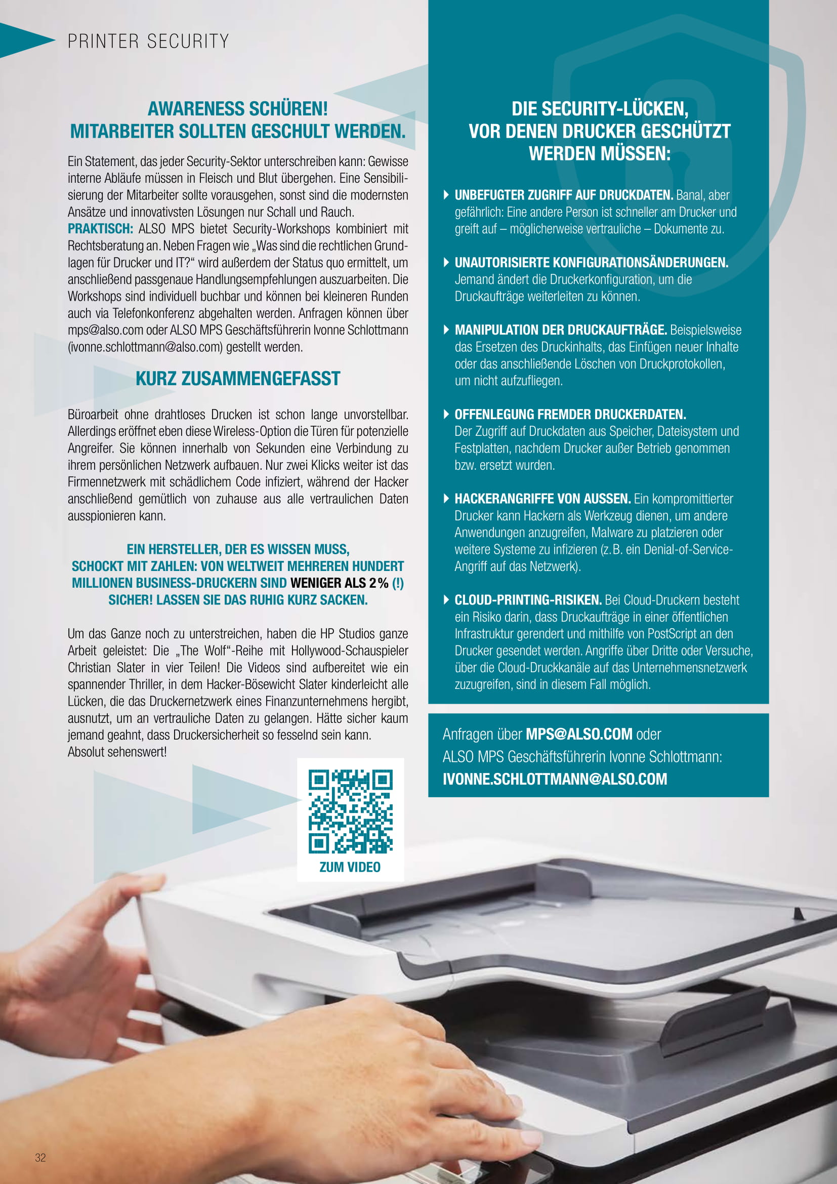 Praktisch: Die ALSO MPS bietet Security Workshops kombiniert mit Rechtsberatung an. Neben Fragen wie „Was sind die rechtlichen Grundlagen für Drucker und IT?“ wird außerdem der Status Quo ermittelt, um anschließend passgenaue Handlungsempfehlungen auszuarbeiten. Die Workshops sind individuell buchbar und können bei kleineren Runden auch via Telefonkonferenz abgehalten werden. Anfragen können über oder ALSO MPS Geschäftsführerin Ivonne Schlottmann () gestellt werden.
