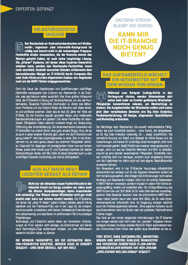 Doch die Dauer der Ausbildungen und Qualifizierungen zukünftiger Fachkräfte verlangsamt den Zustrom von Absolventen in die Branche, was das Vakuum weiter verschärft. Klar, ihren großen Höhepunkt hatte die IT-Branche in Bezug auf Karrierechancen um die Jahrhundertwende. Tausende Fachkräfte überfluteten zu Zeiten des Millennium-Problems und der Dotcom-Blase die Branche, weil sie attraktiv und profitabel erschien. Doch das ist fast 20 Jahre her: Viele der IT-Skills, die die Branche populär gemacht haben, sind mittlerweile Standardanforderungen von gestern. Die vielen Fachkräfte mit ebendiesen Fähigkeiten haben dadurch konstant Angst vor Outsourcing, Offshoring oder Automatisierung. Die heranwachsende Generation der IT-Fachkräfte hat unterm Strich eine ganz andere Sorge. Eine, die es so auch in jeder anderen Branche gibt: „Kann mir die IT-Branche noch genug bieten?“ Und das ungünstiger Weise zu einer Zeit, in der Unternehmen nur so nach ihren neu erlernten Fähigkeiten schreien. Dass sich für diejenigen mit strategischem Knowhow auf hohem Niveau sowie eine Kombi aus IT- und Business-Expertise die besten Karrierechancen bieten, ist Fakt. Doch, ob diese Botschaft auch zu den zukünftigen Experten durchdringt, sei mal so dahingestellt.