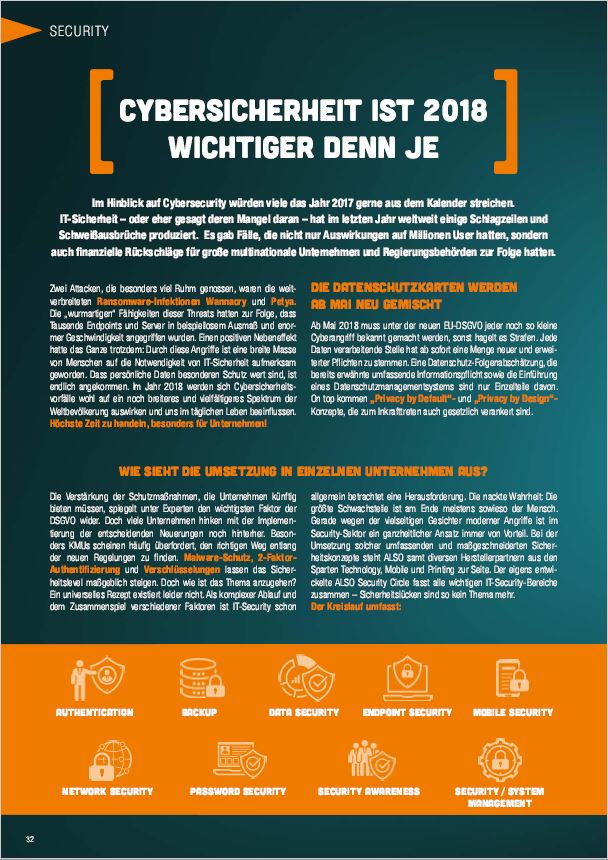 Nicht nur, um für die neue EU-Datenschutz-Grundverordnung gewappnet zu sein, sondern auch um im generellen Angriffen zu entgehen, schreibt ALSO den Bereich IT-Security schon seit Jahren groß. Der ganzheitliche Ansatz ist hierbei ausschlaggebend für eine erfolgreiche Absicherung. Der erste Schritt in die richtige Richtung: Awareness schüren, um Kunden und Mitarbeiter für das Thema zu sensibilisieren und sich bei ALSO über geeignete Lösungen informieren.