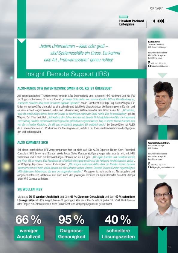 Als mittelständisches IT-Unternehmen vertreibt STW Datentechnik unter anderem HPE-Hardware und hat IRS zur Supportoptimierung für sich entdeckt. „In erster Linie bieten wir unseren Kunden IRS als Dienstleistung an, nutzen die Software aber auch für unsere eigenen Systeme“, erklärt Geschäftsführer Dipl.-Ing. Stefan Wagner. Für Unternehmen wie STW bietet sich so eine schnelle und detaillierte Übersicht über die Bedürfnisse der Kunden und es kann schnell reagiert werden, sollte eine Fehlermeldung auftauchen oder eine Lizenz auslaufen. „Wir wissen, dass da etwas nicht stimmt, bevor der Kunde es überhaupt selbst am Gerät merkt. Das ist unbezahlbar“, erklärt Wagner. Der IT-ler berichtet: „Seit Anfang des Jahres konnten wir bereits fünf Festplatten-Ausfälle von insgesamt rund siebzig Geräten verhindern beziehungsweise glimpflich ausgehen lassen. Das ist spitze! Unsere Kunden sind von der schnellen Reaktion, die IRS uns ermöglicht, begeistert. Wir natürlich auch.“ Bei Sonderfällen hat die ALSO dem Unternehmen einen HPE-Ansprechpartner zugewiesen, mit dem das Problem dann zusammen durchgegangen und behoben wird.