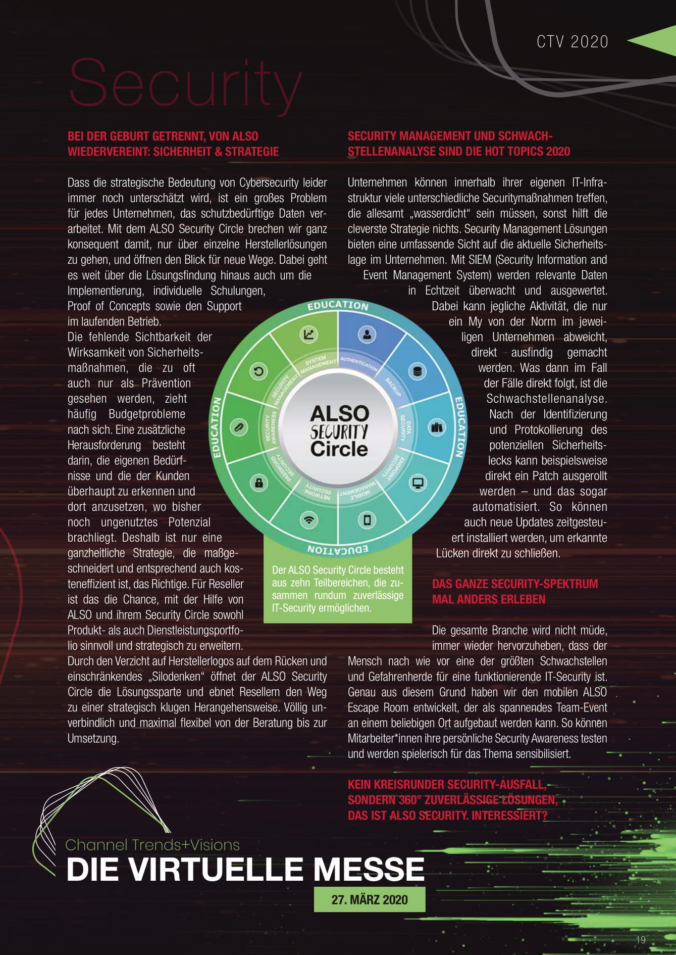 Dass die strategische Bedeutung von Cybersecurity leider immer noch unterschätzt wird, ist ein großes Problem für jedes Unternehmen, das schutzbedürftigen Daten verarbeitet. Mit dem ALSO Security Circle, der dieses Jahr auch wieder als Ganzes auf der CTV abgebildet wird, brechen wir ganz konsequent damit, nur über einzelne Herstellerlösungen zu gehen und öffnen den Blick für neue Wege. Dabei geht es weit über die Lösungsfindung hinaus auch um die Implementierung, individuelle Schulungen, Proof of Concepts sowie den Support im laufenden Betrieb.