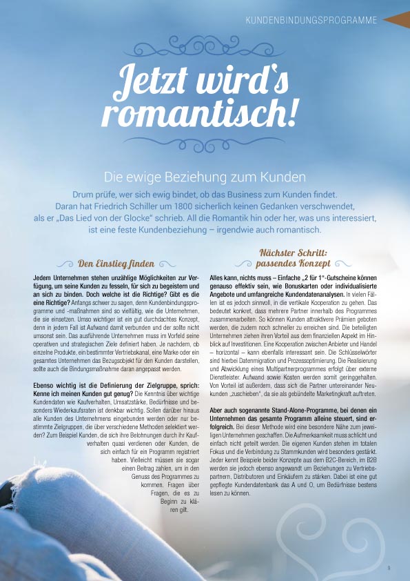Drum prüfe, wer sich ewig bindet, ob das Business zum Kunden findet. Daran hat Friedrich Schiller um 1800 sicherlich keinen Gedanken verschwendet, als er „Das Lied von der Glocke“ schrieb. All die Romantik hin oder her, was uns interessiert, ist eine feste Kundenbeziehung – irgendwie auch romantisch.
