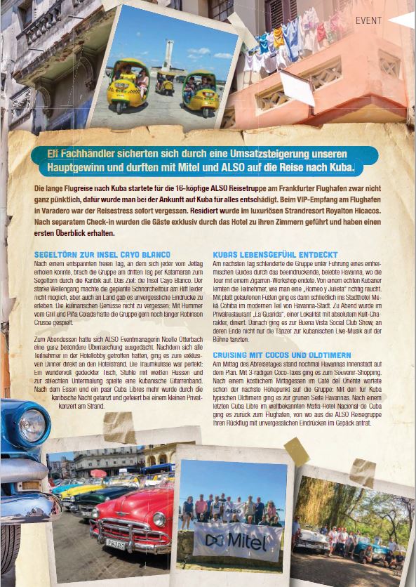 Elf Fachhändler sicherten sich durch eine Umsatzsteigerung unseren Hauptgewinn und durften mit Mitel und ALSO auf die Reise nach Kuba.