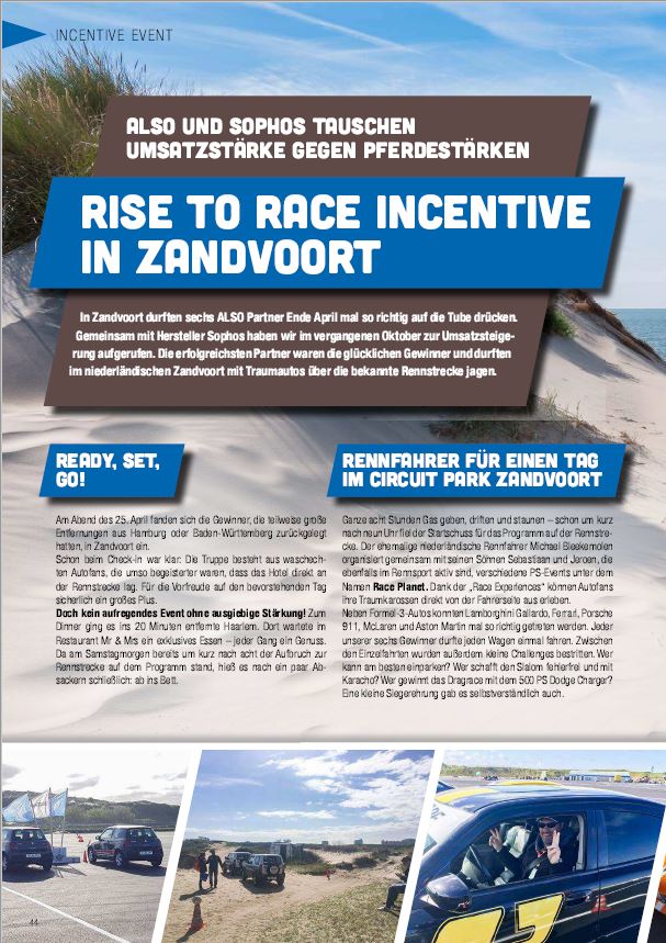 In Zandvoort durften sechs ALSO Partner Ende April mal so richtig auf die Tube drücken. Gemeinsam mit Hersteller Sophos haben wir im vergangenen Oktober zur Umsatzsteigerung aufgerufen. Die erfolgreichsten Partner waren die glücklichen Gewinner und durften im niederländischen Zandvoort mit Traumautos über die bekannte Rennstrecke jagen.