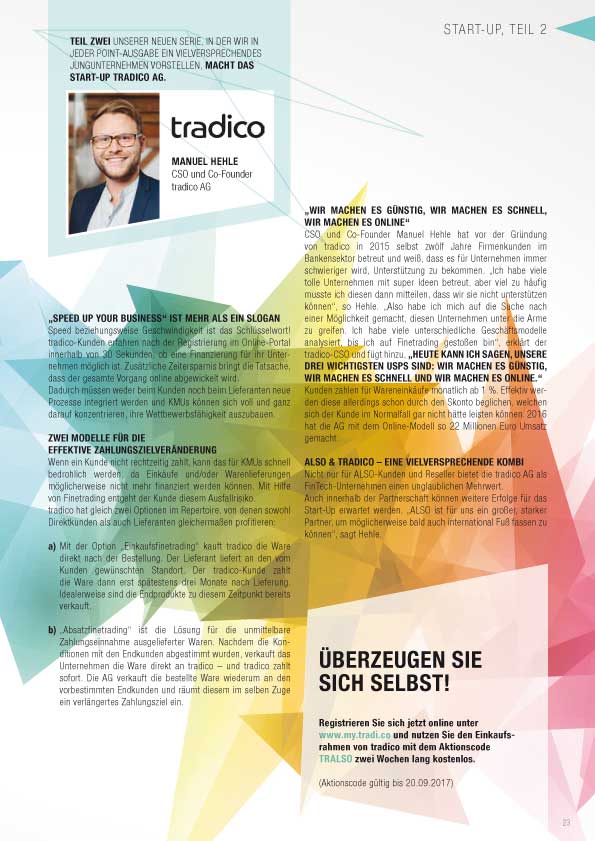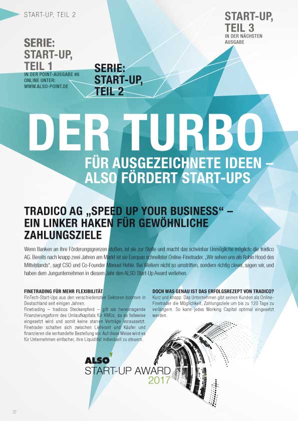 Wenn Banken an ihre Förderungsgrenzen stoßen, ist sie zur Stelle und macht das scheinbar Unmögliche möglich¬: die tradico AG. Bereits nach knapp zwei Jahren am Markt ist sie Europas schnellster Online-Finetrader. „Wir sehen uns als Robin Hood des Mittelstands“, sagt CEO und CO-Founder Manuel Hehle. Bei Weitem nicht so umstritten, sondern richtig clever, sagen wir, und haben dem Jungunternehmen in diesem Jahr den ALSO Start-Up Award verliehen.