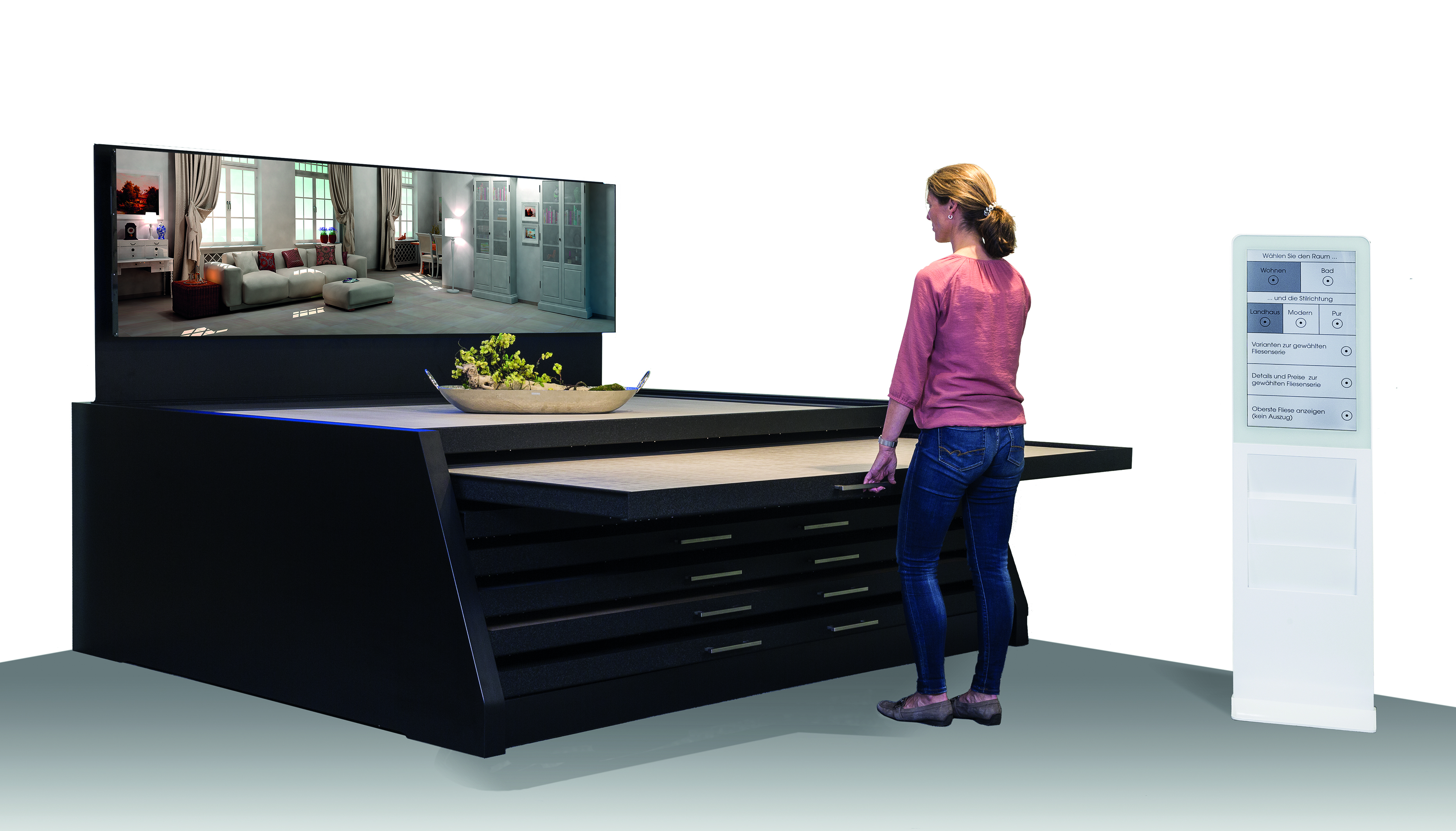 Der stationäre Baustoffhandel bietet den Kunden mit der Digitalisierung seiner Verkaufsräume etwas, was das Internet alleine nicht kann: Der Kunde erlebt hier die Gesamtlösung seines Bau- und Sanierungsvorhabens in einem realen Umfeld gepaart mit den Annehmlichkeiten der digitalen Welt. Das digitale MACH Möbelsystem vernetzt den Wunsch des Kunden nach Gestaltungsvorschlägen und Ideen für sein Projekt mit der interaktiven Produktauswahl im Verkaufsraum. MACH1 ist ein digitaler Bodenschrank, der pro Materialauszug eine emotionale Raumsituation als Anwendungsbeispiel auf einem handelsüblichen Monitor zeigt. Damit wird die zentrale Frage der Kunden danach beantwortet, wie der Boden oder das Parkett im Wohnraum oder Bad tatsächlich aussieht. Die virtuellen Raumbilder vergrößern die Ausstellung enorm und sparen Platz für reale Anwendungsbeispiele. MACH2 ist die nächste Stufe der Kundenorientierung. An einer Bedienstele mit Touchdisplay, wählt der Kunde sein Projekt sowie die gewünschte Stilrichtung aus und bekommt gezielt eine Reihe von Raumbildern gezeigt. Außerdem können sämtliche Informationen wie Farbvarianten und verfügbare Formate zum Produkt hinterlegt werden. Damit beschleunigen die MACH Möbel effizient die Kaufentscheidung. Zusätzlich können die Bewegungsdaten der Auszüge in Form einer Erfolgsstatistik bequem per USB-Stick ausgelesen und das Sortiment an den Kundengeschmack angepasst werden. Ein weiterer Pluspunkt: Die digitale MACH Sensorik lässt sich in vielen Möbelserien von Hauff Ladenbau nachrüsten.